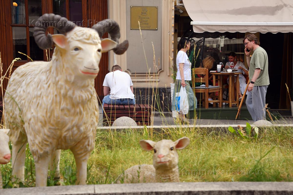 Ограничительные меры в связи с распространением коронавирусной инфекции COVID-19, введенные в Москве с 13 июня 2021 года. Жанровая фотография. Прохожие у летней веранды ресторана.