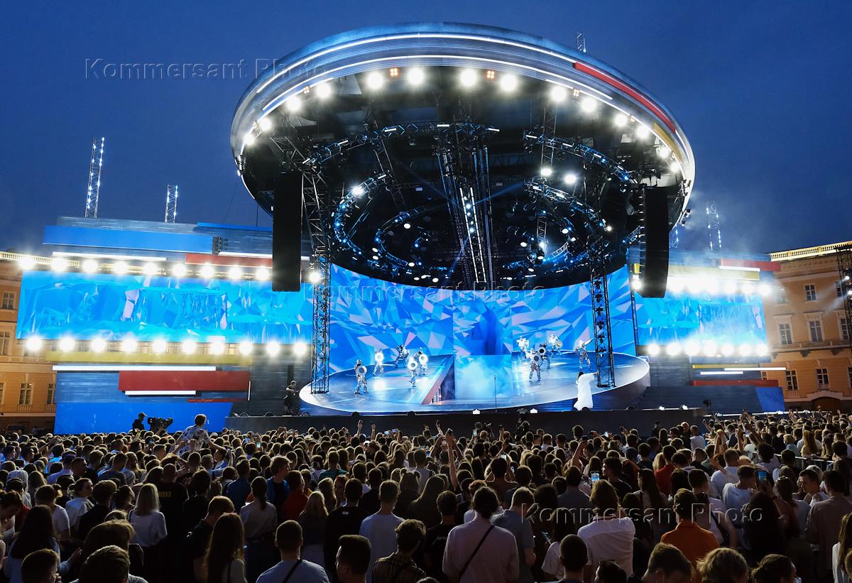Праздник выпускников средних школ Санкт-Петербурга "Алые паруса". Жанровая фотография. Выпускники на Дворцовой площади во время праздничного концерта.