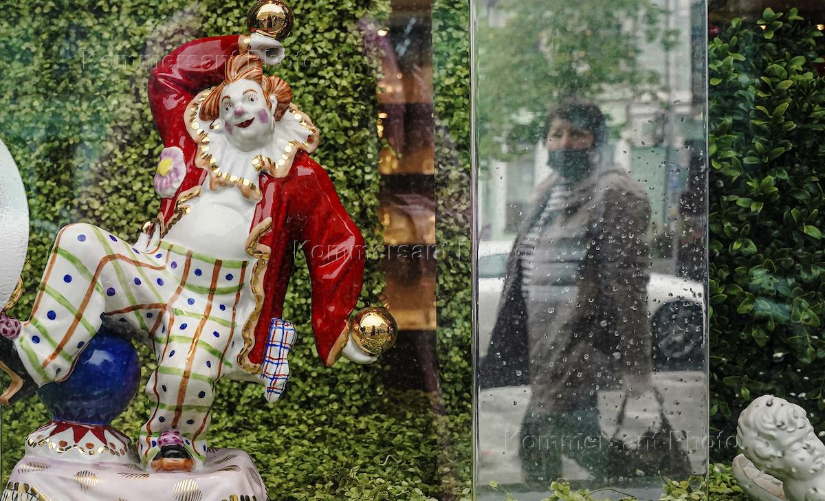 Жанровая фотография. Отражение женщины в защитной маске на лице в стекле витрины. Фигура фарфорового клоуна в витрине.