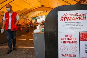 Москва во время усиления мер противодействия распространению коронавирусной инфекции COVID-19. Жанровая фотография. Сотрудник московской ярмарки в медицинской маске с термометром для дистанционного измерения температуры.