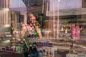Жанровая фотография. Мужчина и женщина под витриной кафе.
