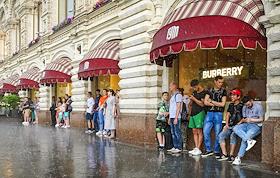 Виды Москвы. Жанровая фотография. Люди прячутся от дождя под навесами на витринах ГУМа.