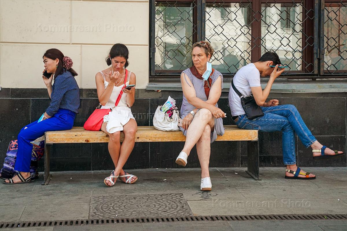 Жанровая фотография. Люди с мобильными телефонами сидят на скамейке.