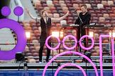 Онлайн-концерт "Сверим сердца" группы "Би-2" на Большой арене спортивного комплекса "Лужники". Участники группы "Би-2" Шура (Александр Уман) (в центре) и Лева (Егор Бортник) (справа) во время съемок концерта.