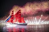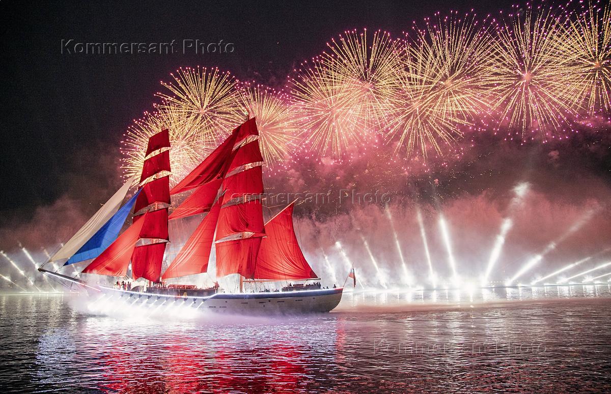 Праздник выпускников школ "Алые паруса". Бриг "Россия" на фоне праздничного салюта.