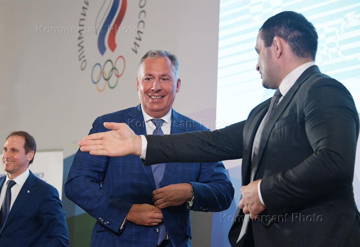 Презентация состава сборной России по дзюдо для участия в Олимпийских играх-2020 в Токио в Олимпийском комитете России (ОКР). Слева направо: президент ОКР Станислав Поздняков, президент Федерации дзюдо России Василий Анисимов и вице-президент Международной федерации дзюдо Сергей Соловейчик перед началом заседания.