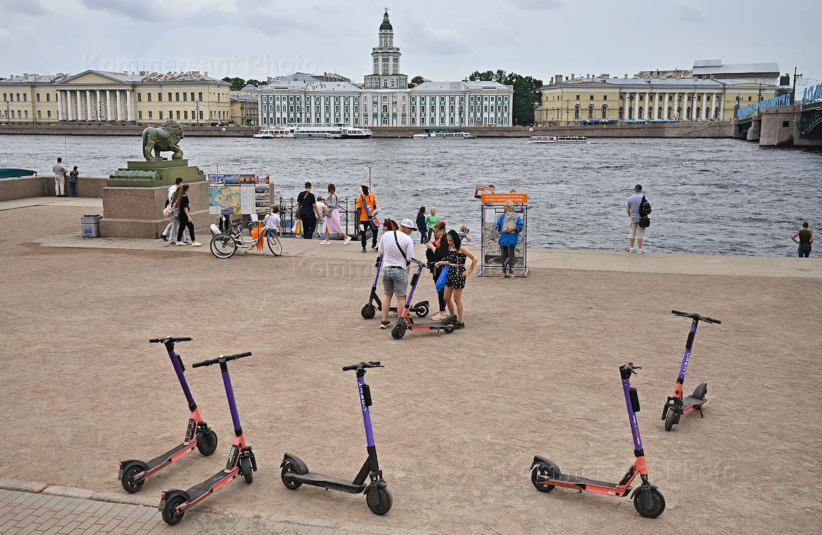 Виды Санкт-Петербурга. Жанровая фотография. Отдыхающие с самокатами на набережной реки Невы.