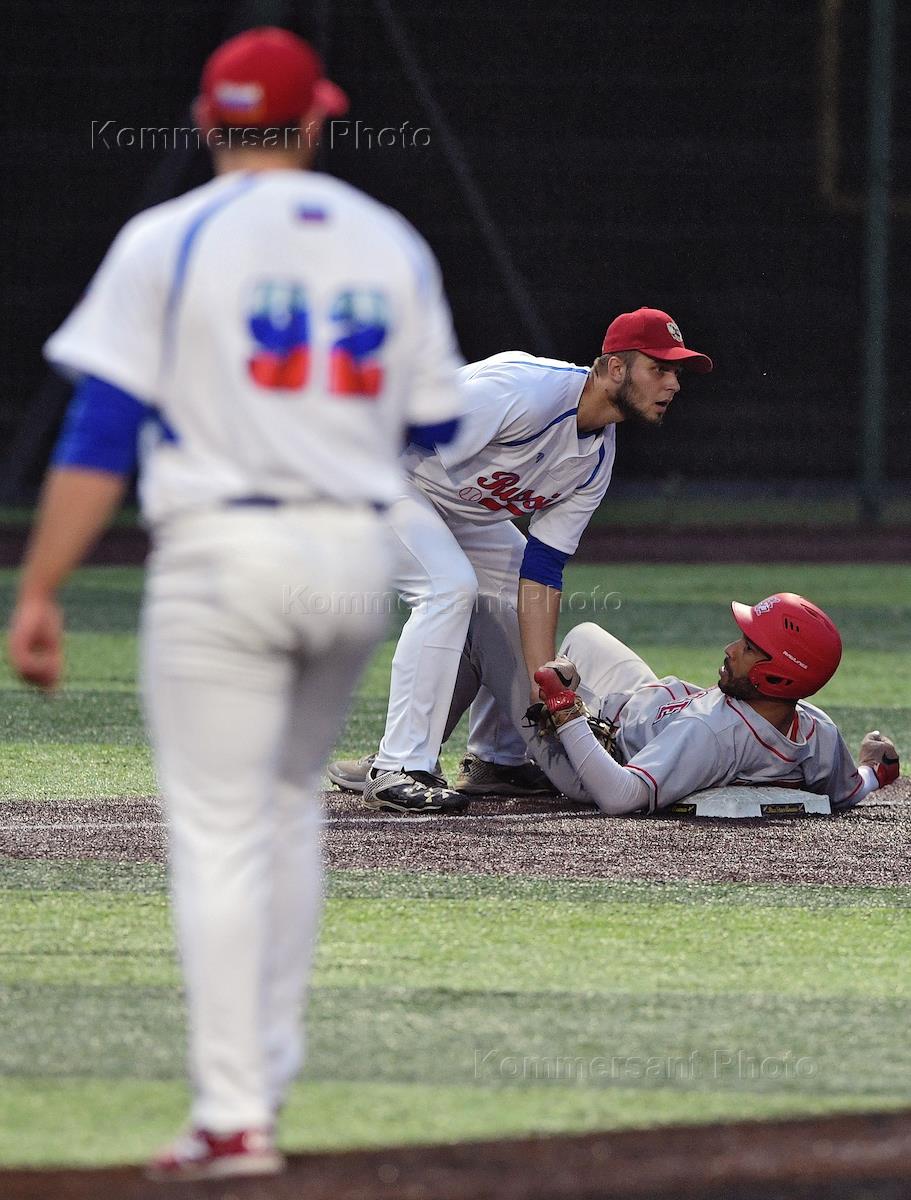Спецпроект "Бейсболисты в Москве". Чемпионат Европы по бейсболу - 2021. Групповые отборочные игры (квалификация). Матч между сборными России и Швейцарии на стадионе Russtar Arena (Русстар арена). Игрок сборной России Антонио Бульте (в центре) во время матча.