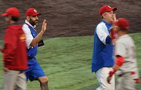 Спецпроект "Бейсболисты в Москве". Чемпионат Европы по бейсболу - 2021. Групповые отборочные игры (квалификация). Матч между сборными России и Швейцарии на стадионе Russtar Arena (Русстар арена). Главный тренер сборной России Владимир Тимаков (справа) после окончания матча.