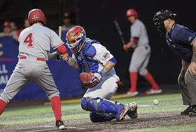 Спецпроект "Бейсболисты в Москве". Чемпионат Европы по бейсболу - 2021. Групповые отборочные игры (квалификация). Матч между сборными России и Швейцарии на стадионе Russtar Arena (Русстар арена). Игрок сборной России Солер Гейдис во время матча.