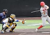Спецпроект "Бейсболисты в Москве". Чемпионат Европы по бейсболу - 2021. Групповые отборочные игры (квалификация). Матч между сборными России и Швейцарии на стадионе Russtar Arena (Русстар арена). Игрок сборной России Солер Гейдис (слева) во время матча.