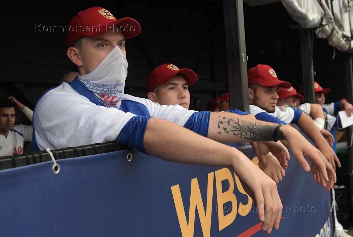 Спецпроект "Бейсболисты в Москве". Чемпионат Европы по бейсболу - 2021. Групповые отборочные игры (квалификация). Матч между сборными России и Швейцарии на стадионе Russtar Arena (Русстар арена). Игроки сборной России перед началом матча.