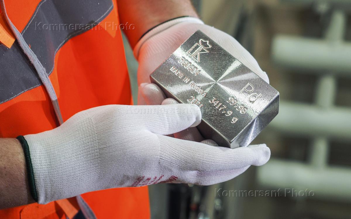 Екатеринбургский завод по обработке цветных металлов (ЕЗ ОЦМ). Сотрудник завода держит в руках слиток сплава - палладия (Pd).