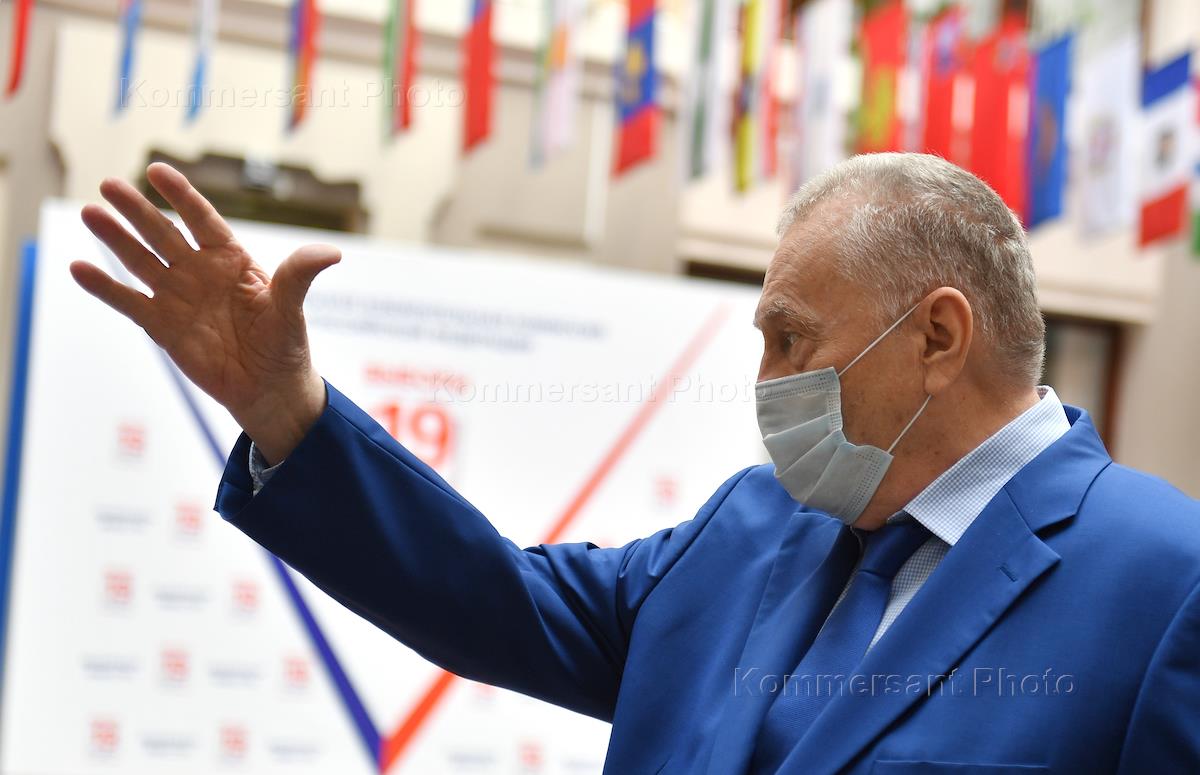 Процедура подачи документов Либерально-демократической партии России (ЛДПР) на регистрацию к предстоящим выборам депутатов Государственной думы России в Центральной избирательной комиссии (ЦИК) России. Лидер ЛДПР Владимир Жириновский перед началом процедуры.