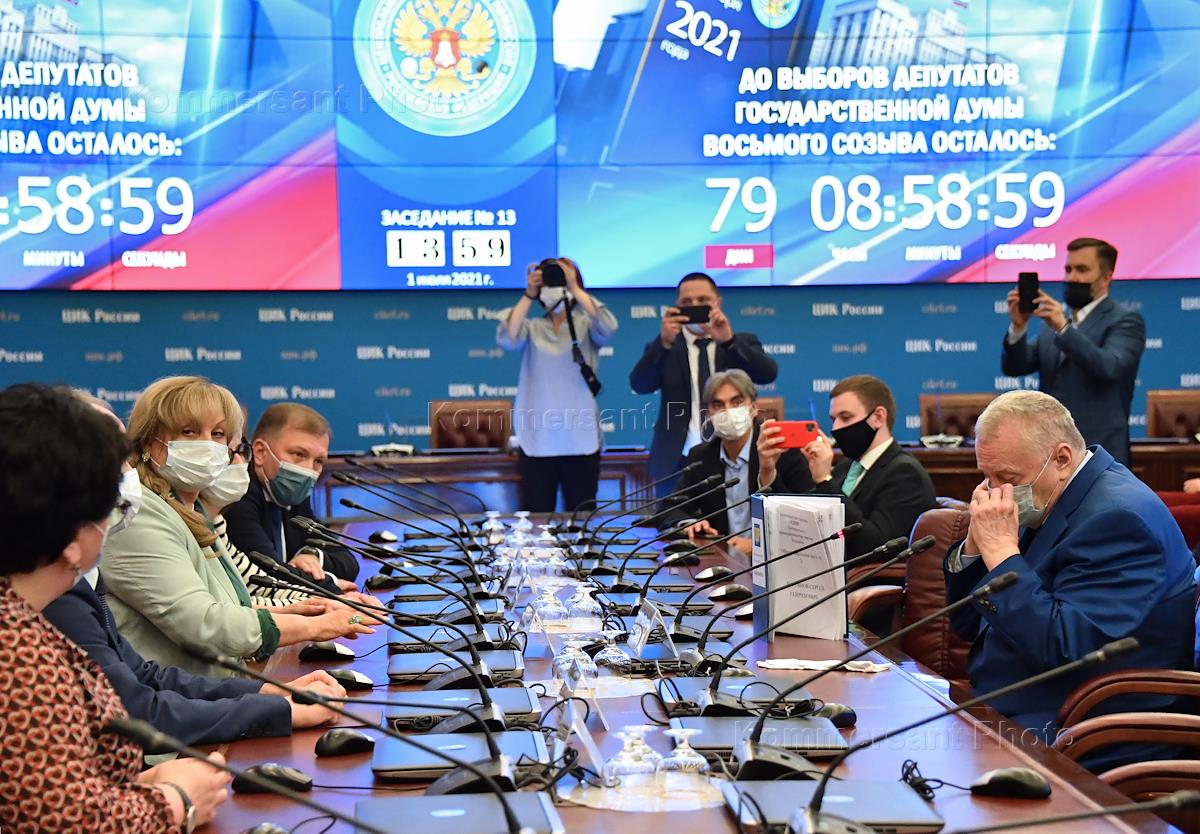 Процедура подачи документов Либерально-демократической партии России (ЛДПР) на регистрацию к предстоящим выборам депутатов Государственной думы России в Центральной избирательной комиссии (ЦИК) России. Председатель ЦИК России Элла Памфилова (вторая слева) и лидер ЛДПР Владимир Жириновский (справа) во время процедуры.