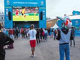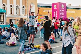 Чемпионат Европы по футболу ЕВРО-2020. Жанровая фотография Болельщики во время просмотра матча между сборными Финляндии и России в фан-зоне на Конюшенной площади.