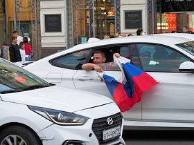 Виды Санкт-Петербурга во время Чемпионата Европы по футболу ЕВРО-2020. Невский проспект. Жанровая фотография. Болельщик с флагом России в окне автомобиля.