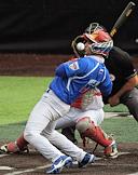 Спецпроект "Бейсболисты в Москве". Чемпионат Европы по бейсболу - 2021. Групповые отборочные игры (квалификация). Матч между сборными России и Белоруссии на стадионе Russtar Arena (Русстар арена). Игрок сборной России Джуниор Вальенте (в центре) во время матча.