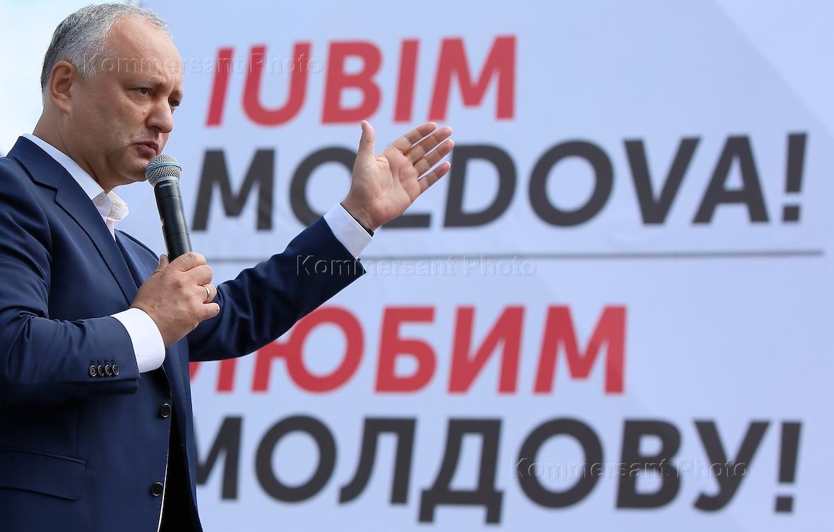 Акция "Я люблю Молдову", организованная избирательным блоком коммунистов и социалистов, на площади перед академией наук Молдовы. Председатель Партии социалистов Молдавии Игорь Додон во время акции.
