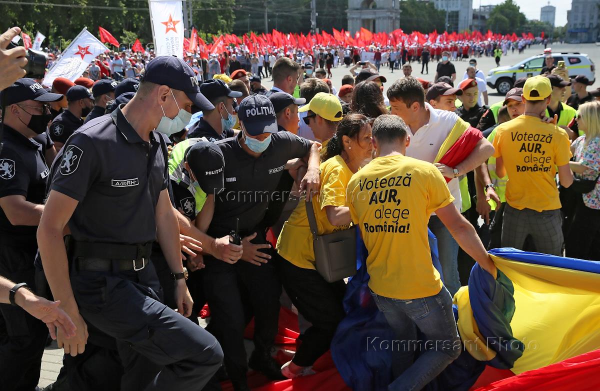 Акция "Я люблю Молдову", организованная избирательным блоком коммунистов и социалистов, на площади перед академией наук Молдовы. Сотрудники полиции во время задержания членов румынской ультрапрпавой партии AUR.