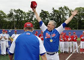 Спецпроект "Бейсболисты в Москве". Чемпионат Европы по бейсболу - 2021. Финал групповых отборочных игры. Матч между сборными Белоруссии и России на стадионе Russtar Arena (Русстар Арена). Главный тренер сборной России Владимир Тимаков (справа) перед началом матча.