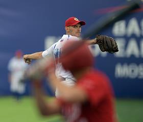 Спецпроект "Бейсболисты в Москве". Чемпионат Европы по бейсболу - 2021. Финал групповых отборочных игры. Матч между сборными Белоруссии и России на стадионе Russtar Arena (Русстар Арена). Игрок сборной России во время матча.
