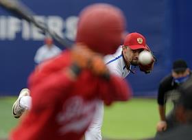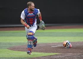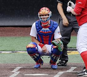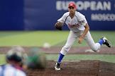 Спецпроект "Бейсболисты в Москве". Чемпионат Европы по бейсболу - 2021. Финал групповых отборочных игры. Матч между сборными Белоруссии и России на стадионе Russtar Arena (Русстар Арена). Игрок сборной России Никита Монахов во время матча.