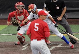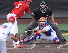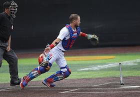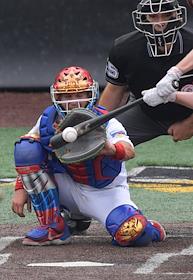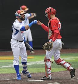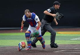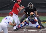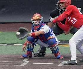 Спецпроект "Бейсболисты в Москве". Чемпионат Европы по бейсболу - 2021. Финал групповых отборочных игры. Матч между сборными Белоруссии и России на стадионе Russtar Arena (Русстар Арена). Игрок сборной России Никита Монахов (слева) во время матча.