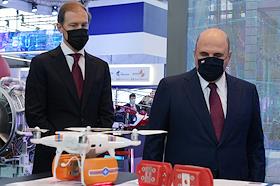 Рабочая поездка председателя России Михаила Мишустина в Екатеринбург. Председатель правительства России Михаил Мишустин (справа) во время посещения стенда ОАО "Концерн ПВО "Алмаз – Антей" на Международной промышленной выставки "Иннопром-2021".
