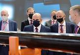 Рабочая поездка председателя России Михаила Мишустина в Екатеринбург. Председатель правительства России Михаил Мишустин (в центре) во время посещения стенда ОАО "Концерн ПВО "Алмаз – Антей" на Международной промышленной выставки "Иннопром-2021".