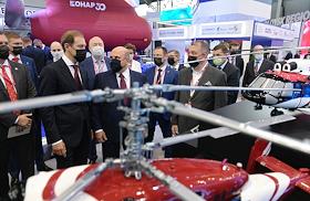 Рабочая поездка председателя России Михаила Мишустина в Екатеринбург. Председатель правительства России Михаил Мишустин (справа) и министр промышленности и торговли России Денис Мантуров (второй справа) во время посещения стенда ГК "Ростех" на Международной промышленной выставки "Иннопром-2021".
