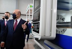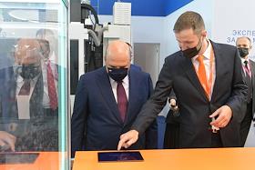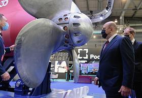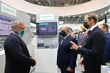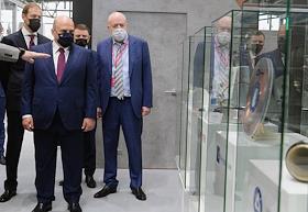 Рабочая поездка председателя России Михаила Мишустина в Екатеринбург. Председатель правительства России Михаил Мишустин (справа) во время посещения стенда ОАО "Концерн ПВО "Алмаз – Антей" на Международной промышленной выставки "Иннопром-2021".