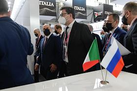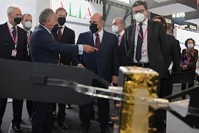 Рабочая поездка председателя России Михаила Мишустина в Екатеринбург. Председатель правительства России Михаил Мишустин (в центре) и министр промышленности и торговли России Денис Мантуров (четвертый слева) во время посещения Национаонального павильона Италии на Международной промышленной выставки "Иннопром-2021".