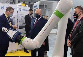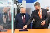 Рабочая поездка председателя России Михаила Мишустина в Екатеринбург. Председатель правительства России Михаил Мишустин (справа) во время посещения стенда компании KUKA на Международной промышленной выставки "Иннопром-2021".