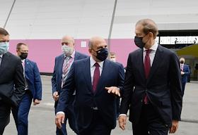 Рабочая поездка председателя России Михаила Мишустина в Екатеринбург. Председатель правительства России Михаил Мишустин (слева) и министр промышленности и торговли России Денис Мантуров (справа) во время посещения стенда ООО "ПК "Транспортные системы" на Международной промышленной выставки "Иннопром-2021".