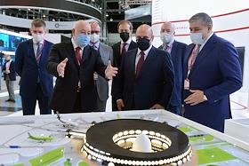 Рабочая поездка председателя России Михаила Мишустина в Екатеринбург. Председатель правительства России Михаил Мишустин (в центре), министр промышленности и торговли России Денис Мантуров (четвертый слева), председатель комитета Государственной думы России по государственному строительству и законодательству Павел Крашенинников (второй справа) и председатель попечительского совета Сколковского института науки и технологий (СколТех), председатель совета директоров ГК "Ренова" Виктор Вексельберг (второй слева) во время посещения стенда Группы компаний "Ренова" у макета проекта аэропорта в Елизово на Камчатке на Международной промышленной выставки "Иннопром-2021".