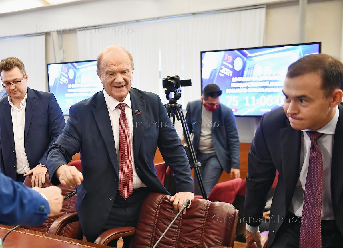 Церемония передачи документов для выдвижения кандидатов на выборах депутатов Государственной думы России VIII созыва от партии КПРФ в Центральную избирательную комиссию (ЦИК) России в здании ЦИК России. Лидер КПРФ, член комитета Государственной думы (ГД) России по делам Содружества Независимых Государств, евразийской интеграции и связям с соотечественниками Геннадий Зюганов (в центре) и первый заместитель председателя комитета ГД России по природным ресурсам, собственности и земельным отношениям, первый заместитель председателя ЦК КПРФ Юрий Афонин (справа) перед началом церемонии.