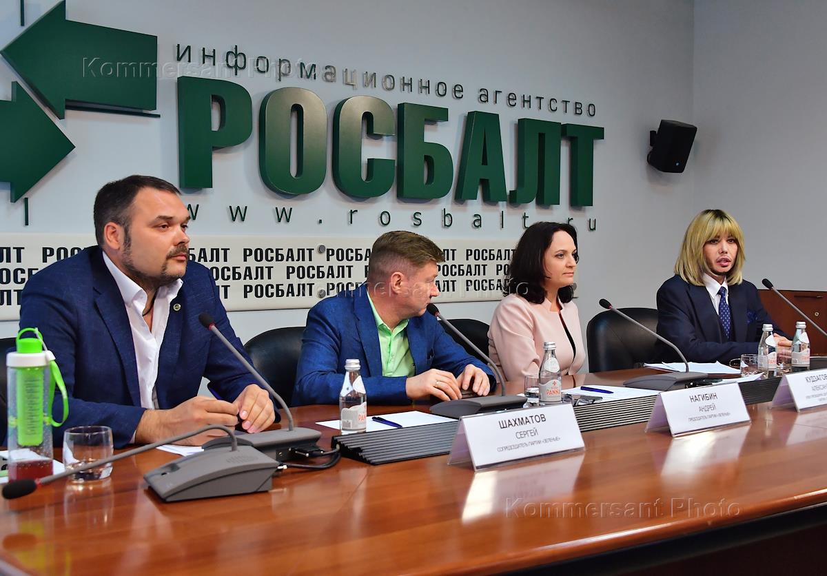 Пресс-конференция российской экологической партии "Зеленые" в пресс-центре "Росбалт". Слева направо: исполнительный директор открытой экологической платформы "Российские зелёные", заместитель председателя комиссии по охране окружающей среды и формированию здорового образа жизни Красноярского края Сергей Шахматов, заместитель председателя Общественного Совета при Росприроднадзоре, председатель правления общероссийской общественной организации "Зелёный Патруль" Андрей Нагибин, стилист Сергей Зверев и исполнительный директор Фонда рационального природопользования Александр Кудзагова во время пресс-конференции.