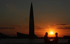 Виды Санкт-Петербурга. Жанровая фотография. Горожане на набережной возле стадиона "Зенит Арена" напротив делового комплекса "Лахта Центр".