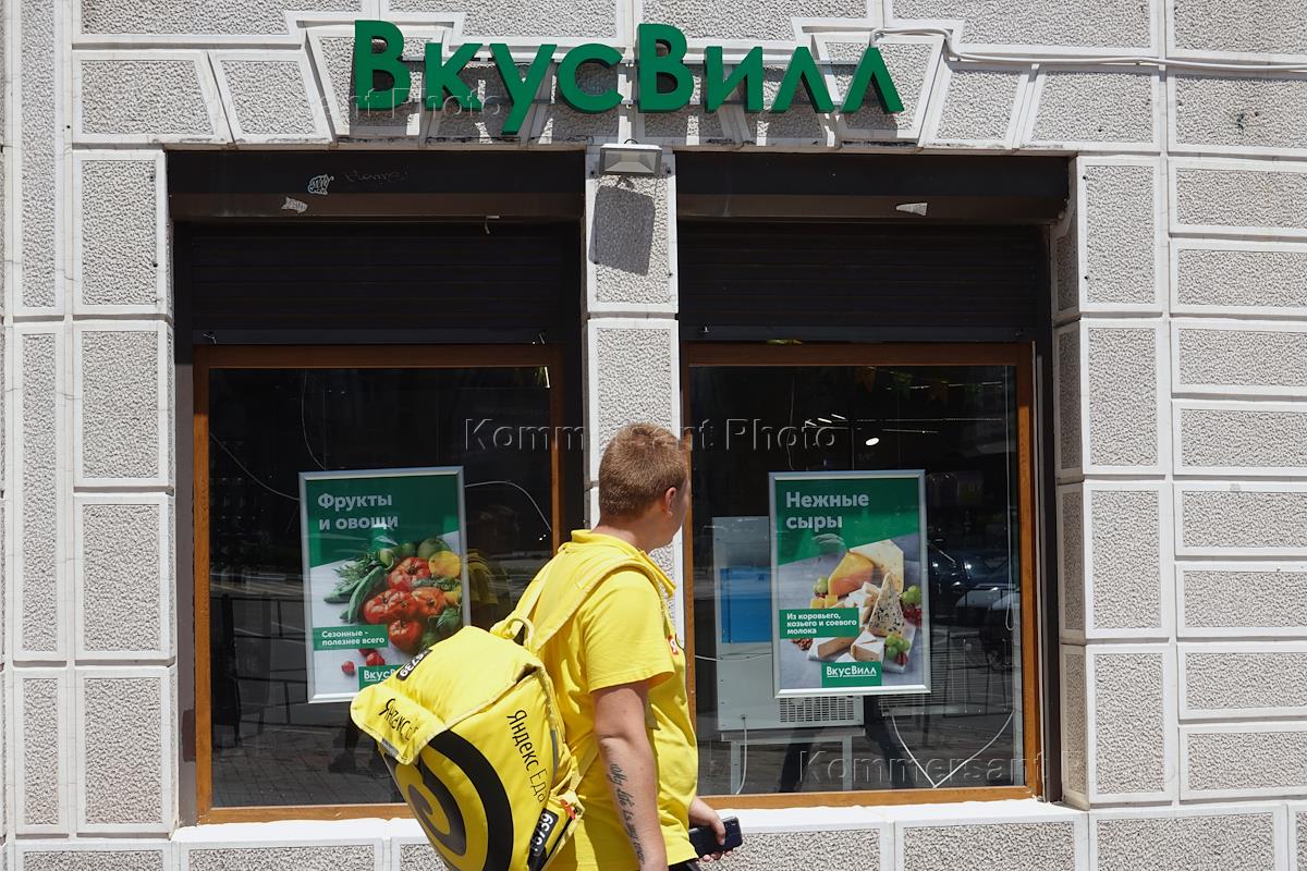 Виды Новороссийска. Жанровая фотография. Курьер службы доставки еды "Яндекс.Еда" возле витрины магазина "ВкусВилл".