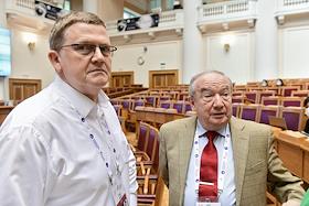 Международная конференция по исследованию космического пространства (Global Space Exploration Conference — GLEX-2021). Первый заместитель директора Института медико-биологических проблем РАН (ИМБП) Олег Орлов (слева) и заведующий отделом внедрения, реализации и пропаганды научных достижений института Института медико-биологических проблем Марк Белаковский (справа) во время конференции.