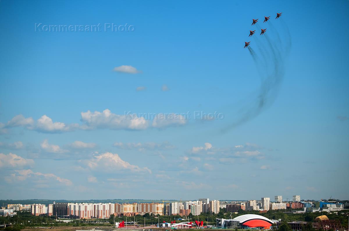 Репетиция авиационной группы высшего пилотажа "Стрижи" перед показом в честь 300-летия Кузбасса.