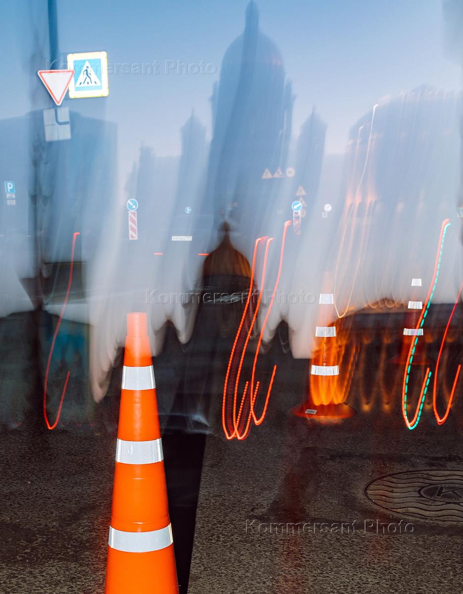 Виды Санкт-Петербурга. Жанровая фотография. Сигнальный дорожный конус на тротуаре на фоне силуэта здания Исаакиевского собора.