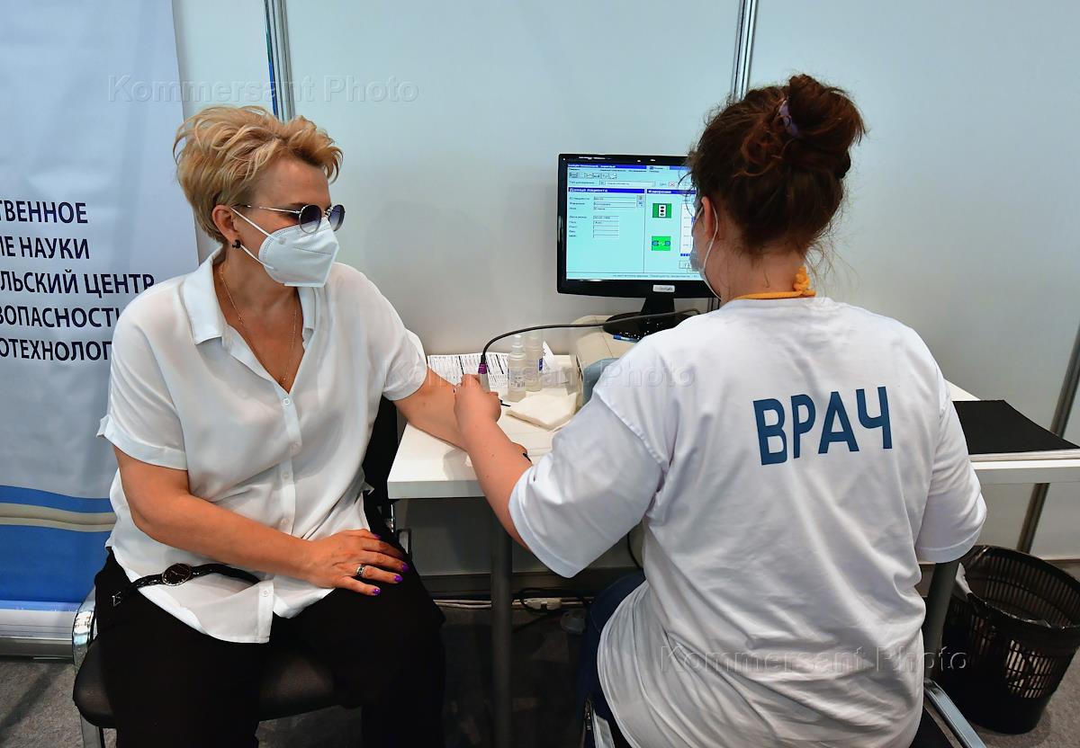 Торжественная церемония открытия Всероссийского форума "Здоровье нации - основа процветания России" в ЦВЗ "Манеж". Прием пациента врачом на стенде в ввыставочном зале форума.