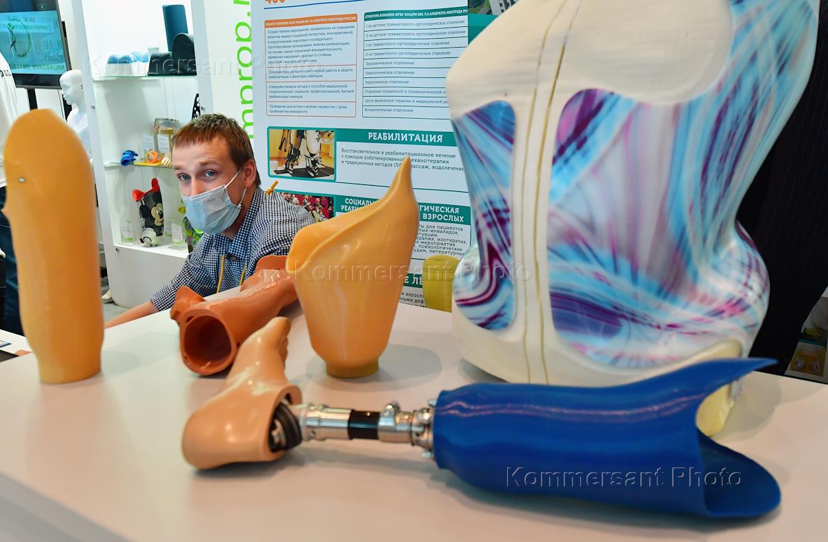 Торжественная церемония открытия Всероссийского форума "Здоровье нации - основа процветания России" в ЦВЗ "Манеж". Стенд ФГБУ "Федеральный научный центр реабилитации инвалидов имени Г. А. Альбрехта" в выставочном зале форума.