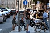 Пикет с участием пациентов, страдающих спинально-мышечной атрофией (СМА), в поддержку проблемы получения необходимого лекарства для жизни у взрослых пациентов со СМА, у здания Министерства здравоохранения России. Жанровая фотография. Знак "Инвалид" на здании министерства.