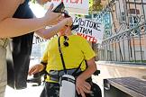 Пикет с участием пациентов, страдающих спинально-мышечной атрофией (СМА), в поддержку проблемы получения необходимого лекарства для жизни у взрослых пациентов со СМА, у здания Министерства здравоохранения России. Жанровая фотография. Девушка-участница пикета на инвалидном кресле.