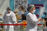 Работа сотрудников центров услуг "Мои документы" и Департамента социальной защиты Москвы в пункте вакцинации в Гостином Дворе.