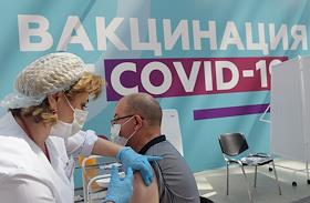 Работа сотрудников центров услуг "Мои документы" и Департамента социальной защиты Москвы в пункте вакцинации в Гостином Дворе. Медицинский работник делает укол пациенту.
