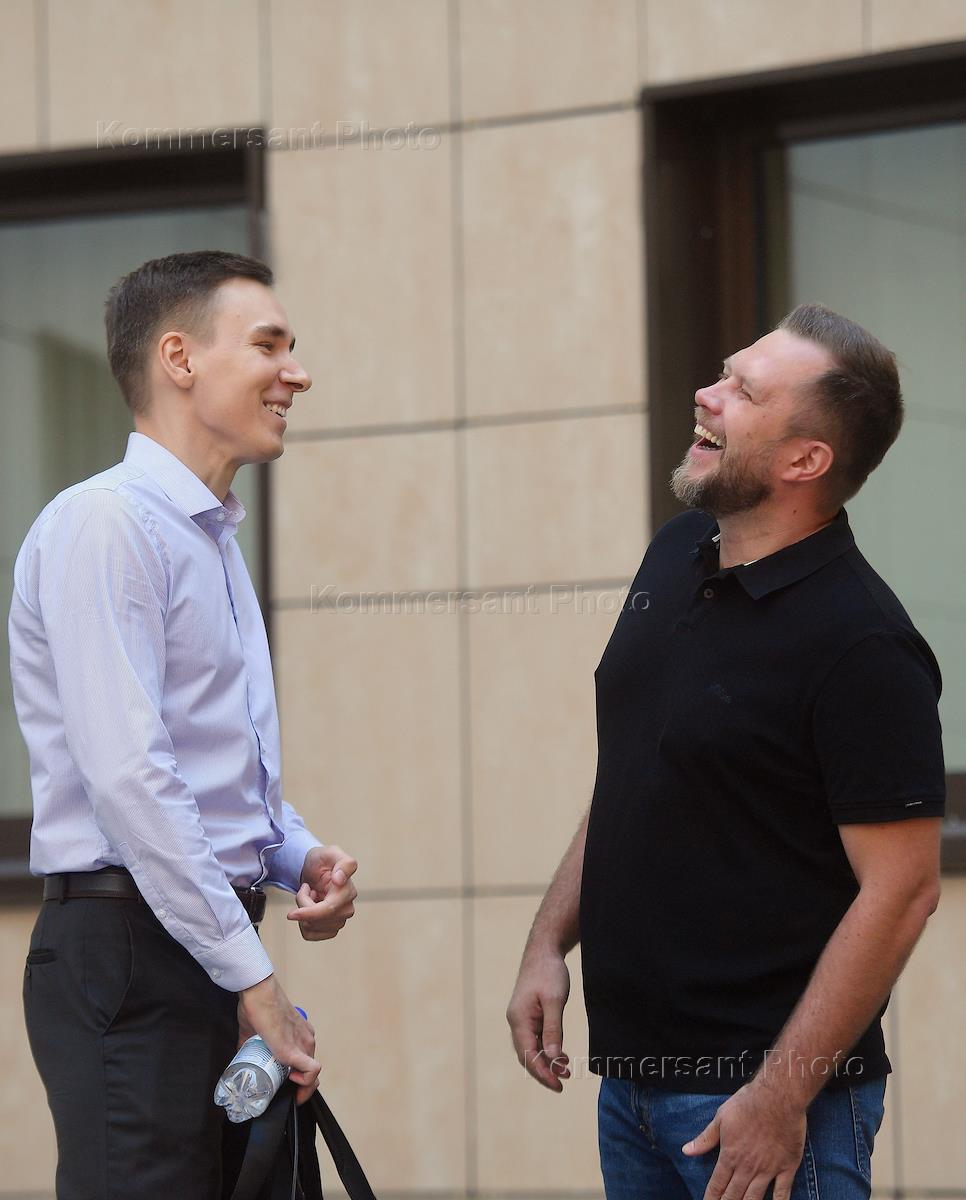 Рассмотрение уголовного дела в отношении сотрудника Фонда борьбы с коррупцией (ФБК) (ликвидированный иноагент, организация признана экстремистской, ее деятельность запрещена) Николая Ляскина, обвиняемого в подстрекательстве к нарушению санитарных норм на акции 23 января в Москве, в Преображенском районном суде. Сотрудник Фонда борьбы с коррупцией (ФБК) (внесен Минюстом России в реестр иноагентов) Николай Ляскин (справа) и адвокат Сергей Тельнов (слева) перед началом заседания суда.